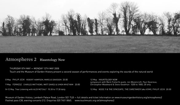 Atmospheres 2 focused on ‘Hauntology’. Various definitions of this slippery concept can be found on the web. I liked this one: ‘Derrida in his Specters of Marx …reflects on the persistance of the concept of (utopian) revolution despite its apparent eradication from the scene of politics and history (the book is ‘work of mourning’ published in the early 90s after the fall of the Berlin Wall and the inaugeration of the ‘end of history’). As such the concept of social and political revolution takes on a ghostly aspect – present and not present, eluding the categorical definition of western metaphysics, apparently erased yet still palpable in traces and echoes and uncanny visitations.”